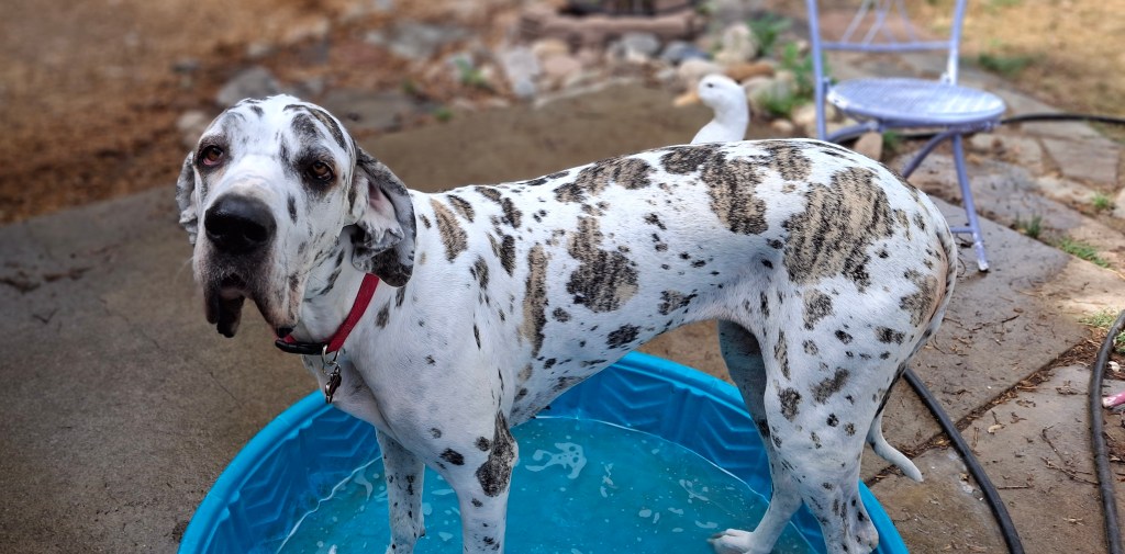 Jasper, not so big on getting in the pool (don’t even ask me about indoor bathtime, lifting a 137 lb Great Dane into a tub is not for wimps), but he was fine with the water massage and copious treats. Outside the pool.