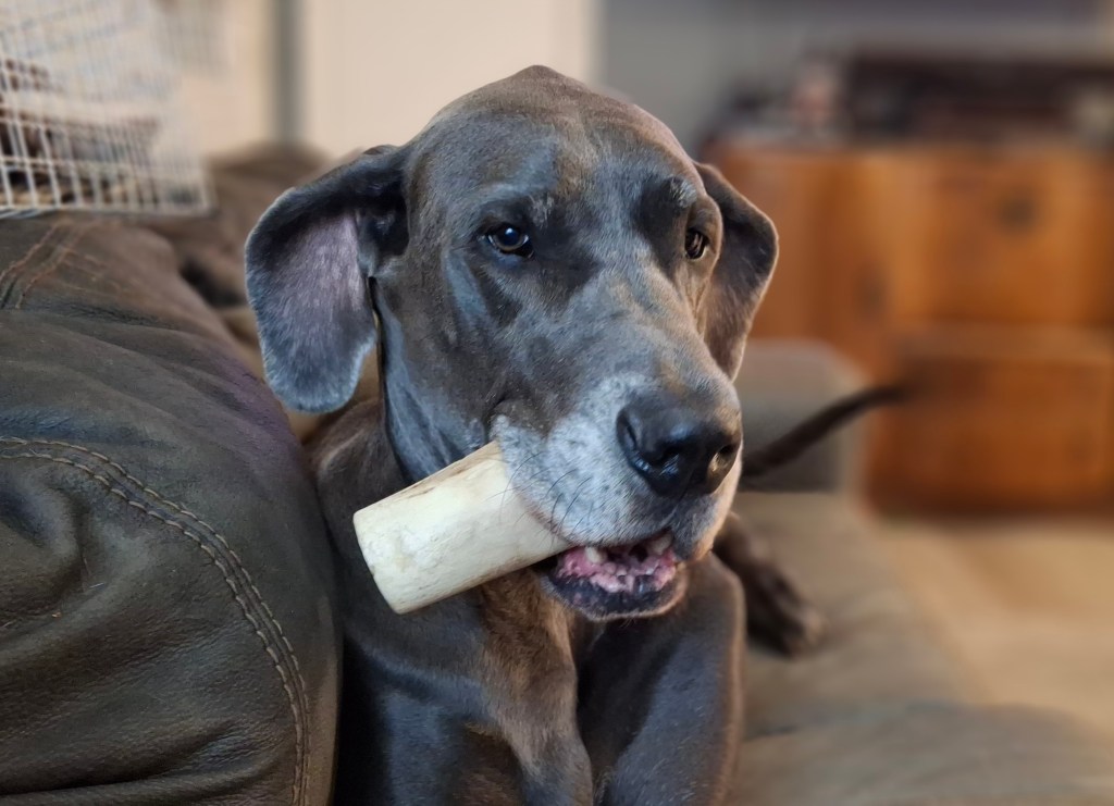 Someone knows bones are not allowed on the couch, so his face is all innocence, and you can hear the thought bubble, “what bone?”