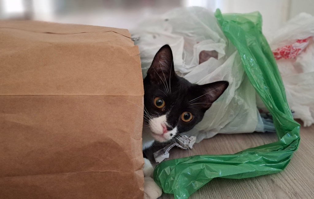 “Paper or plastic?” Reggie, “helping” as he likes to do.