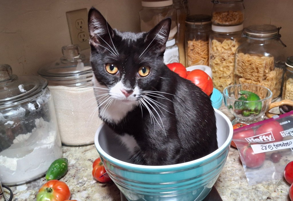 Reggie is 7 months old today, so it seemed like a good day to weigh him. He weighed in at exactly 7.5 lbs. And yes, he’s sitting in a mixing bowl (he graduated to my large one) on the food scale.