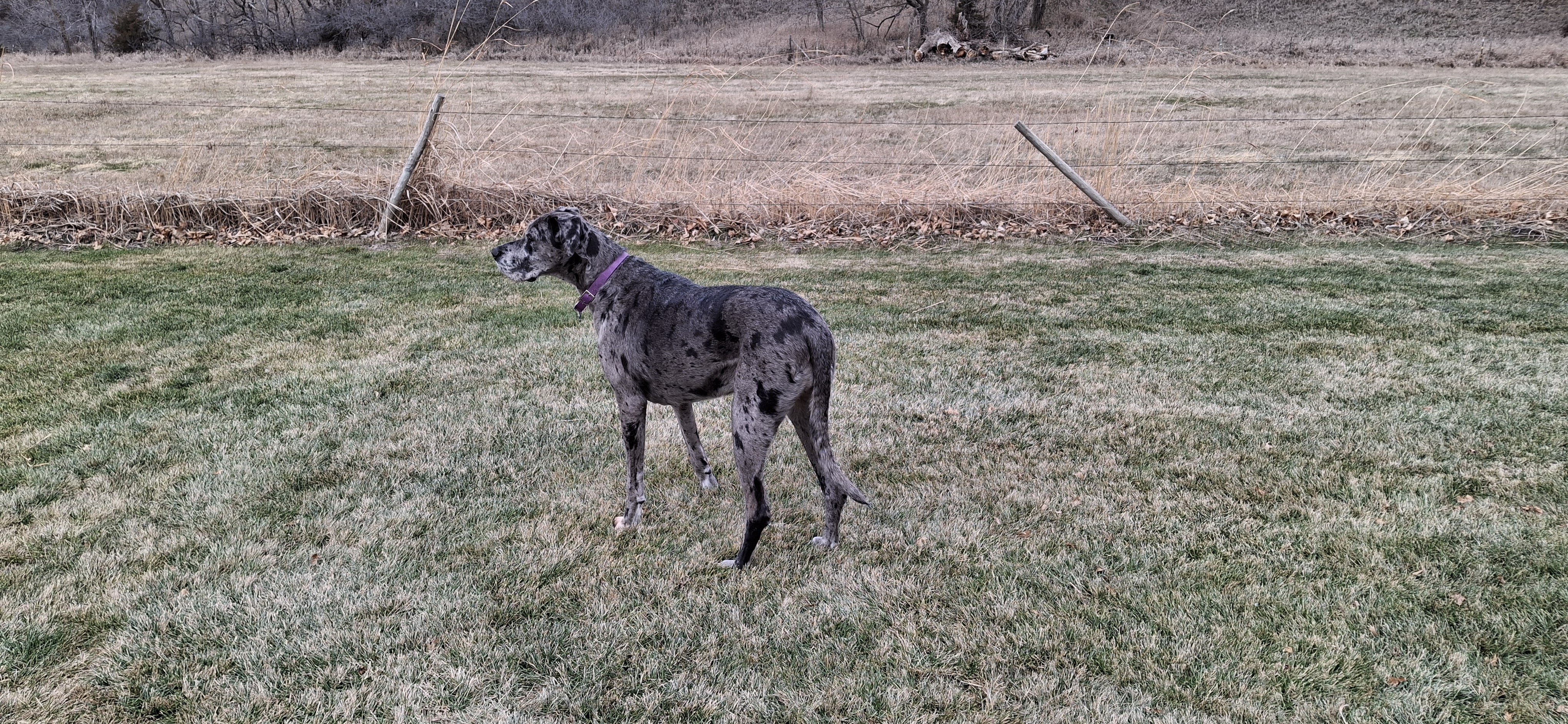 Scout enjoying her freedom, but she does miss the horse that used to be in the pasture next door.