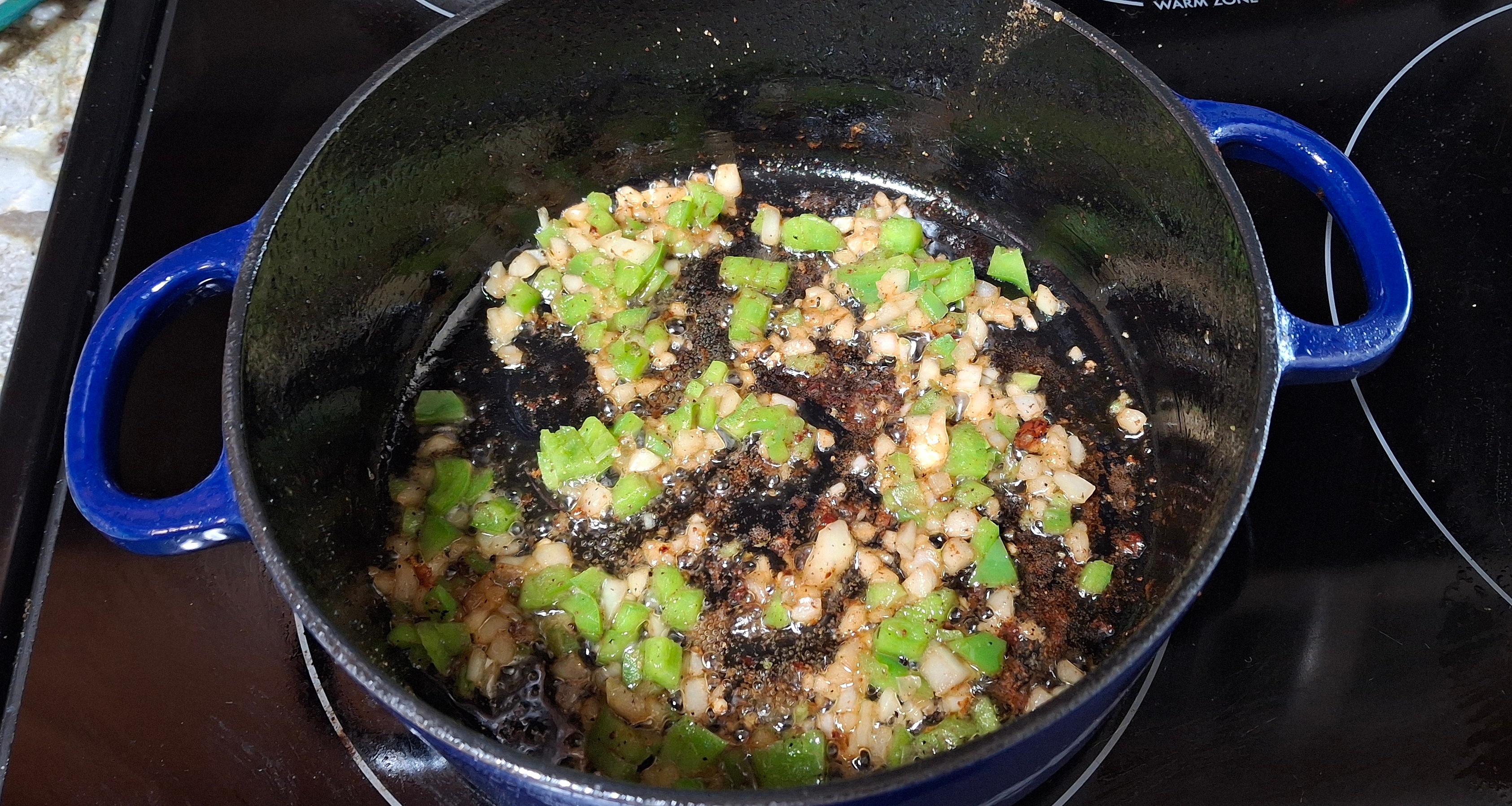 Add onions and peppers to the rendered chicken fat, add a bit of olive oil if needed, and sauté until onions are translucent. Add garlic and stir for a minute.