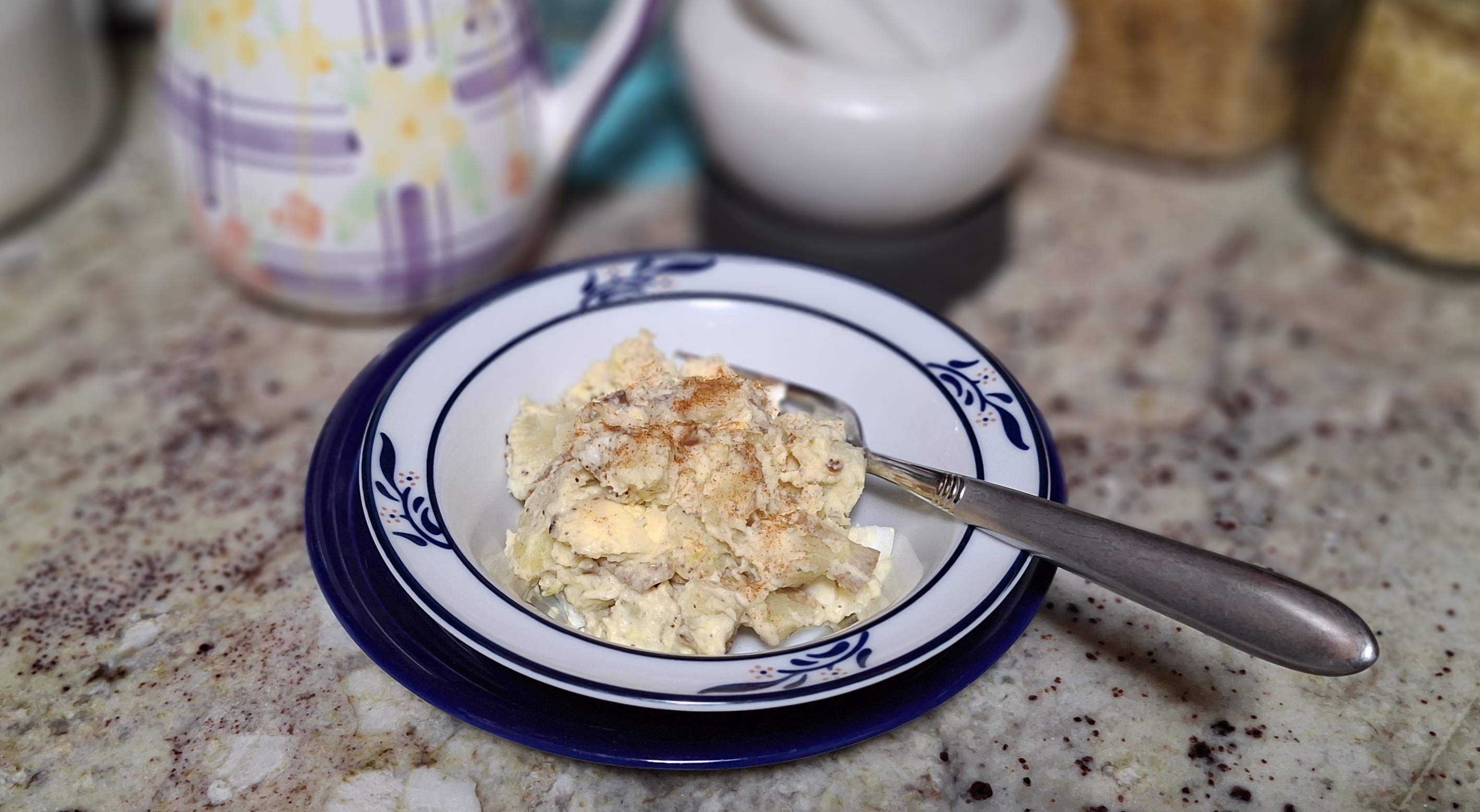 Remove the eggs and run cold water over them. Remove potatoes and drain excess water. Add to a large serving bowl. Peel eggs – fun fact, steamed egg peels slip right off – rinse and cube. Add to potatoes. Let cool completely before mixing so as not to turn the potatoes into mush.