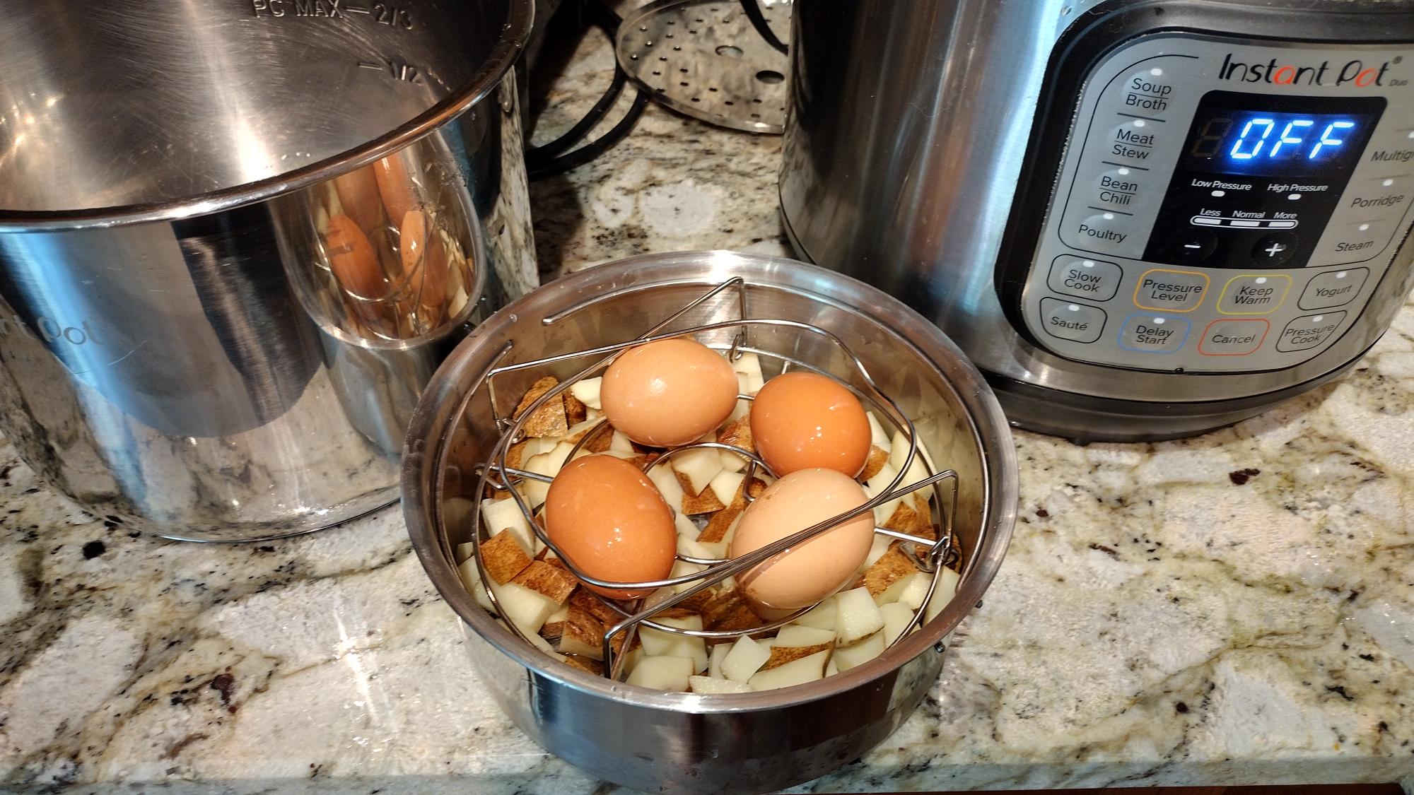 Add the steaming basket to the pressure cooker and add enough water to come to bottom of the basket. Add cubed potatoes (and you don’t need to be too fancy with cutting the pieces – just relatively same size for uniform cooking). Place washed eggs on top of the potatoes (I have an egg rack I use, but you can just put the eggs on the potato cubes). Close the unit, and pressure cook for 4 minutes. When finished, use the rapid-release method to ensure eggs don’t overcook and potatoes stay firm.
