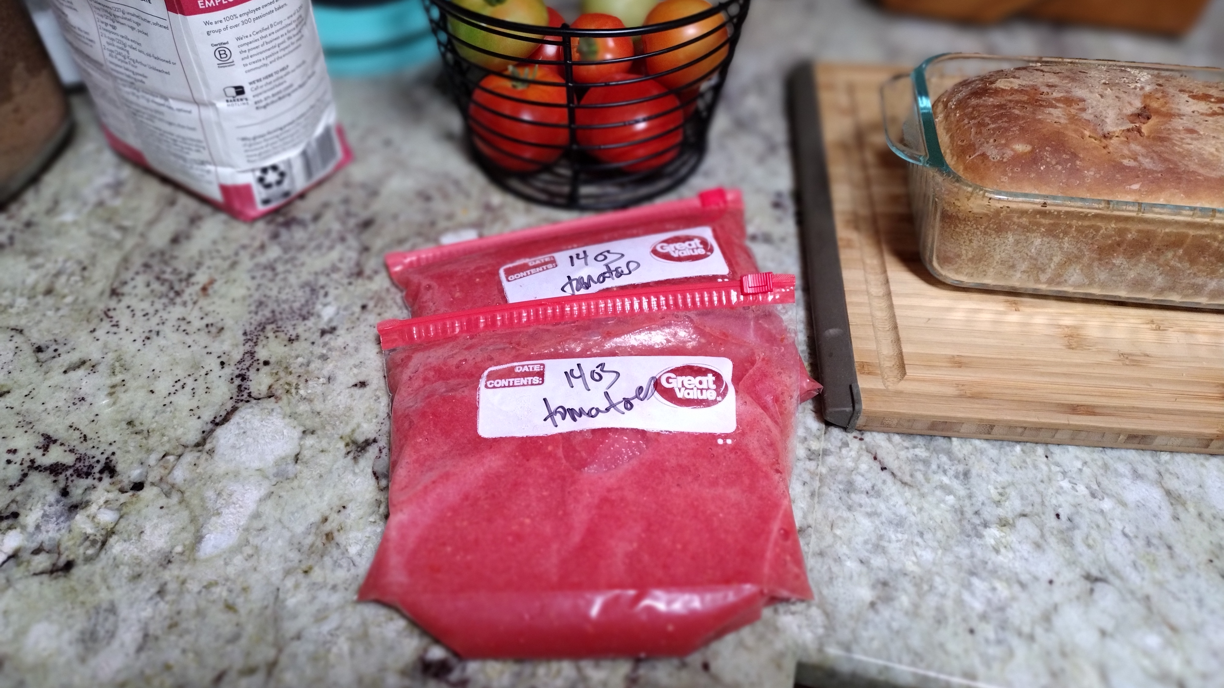 Now to freezing fresh produce. Depending on how they will be used – many fresh fruits and veggies don’t need much prep. I wash and dice peppers, onions, carrots, and chilis*, then freeze them in freezer bags to use in cooked dishes. I wash and run my tomatoes through a blender to create crushed tomatoes for sauces and soups, freezing them in quart bags. I freeze them flat so I can stack them in the freezer.