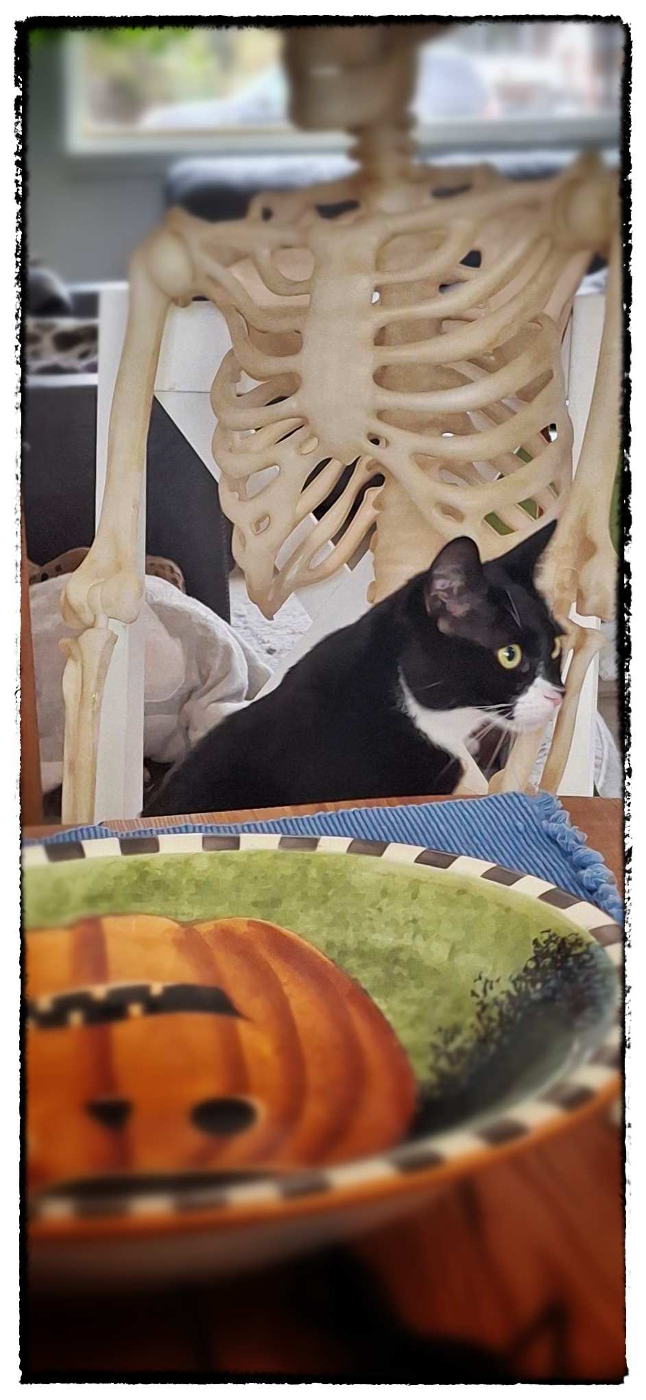 Scout keeping watch for trick-or-treaters while Jasper conserves his energy for the actual door knockers.