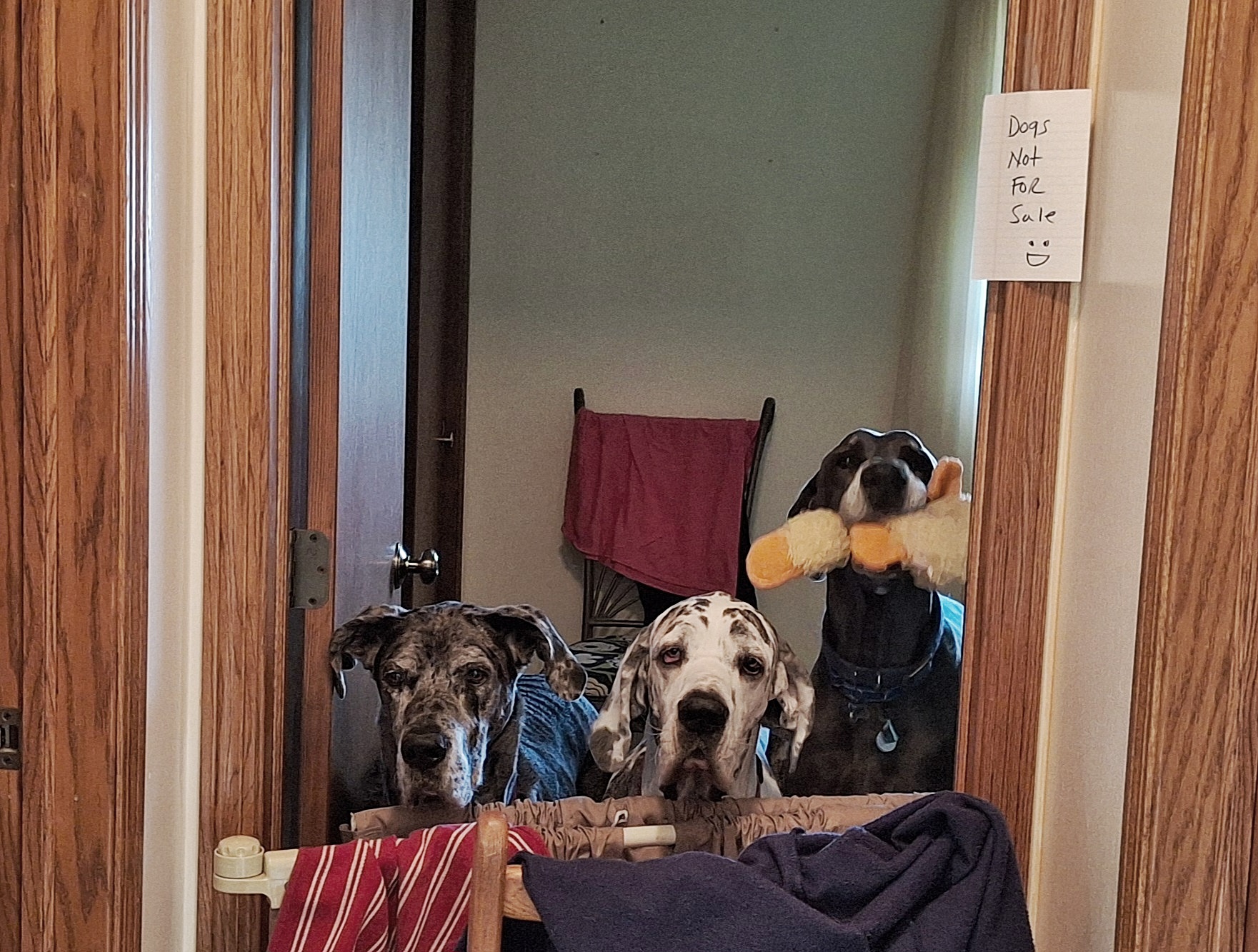 Don’t miss the sign in the upper right-hand corner. The pups were very good while we traveled and held an estate sale to empty my father’s house.