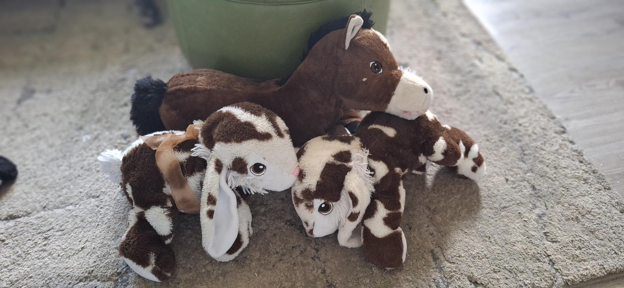 I try very hard to resist getting them any more stuffies, but I saw the two goats at the thrift store, for the outrageous price of $2 each. I had hoped for three, because you cannot bring only two stuffies into the house when there are three dogs. Then I spotted the horse (for the same ridiculous price) and knew it would be Trixie’s newest snuggle stuffie. She likes the big ones for that full-body snuggle.
