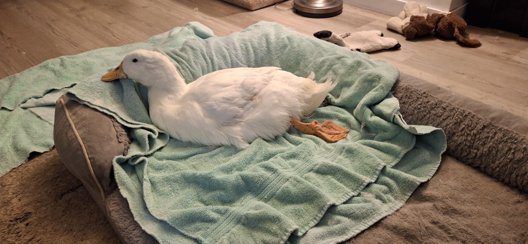 Speaking of hanging out, Nora is getting a little too comfortable with her family time. Look at that little foot – that’s a super relaxed duck.
