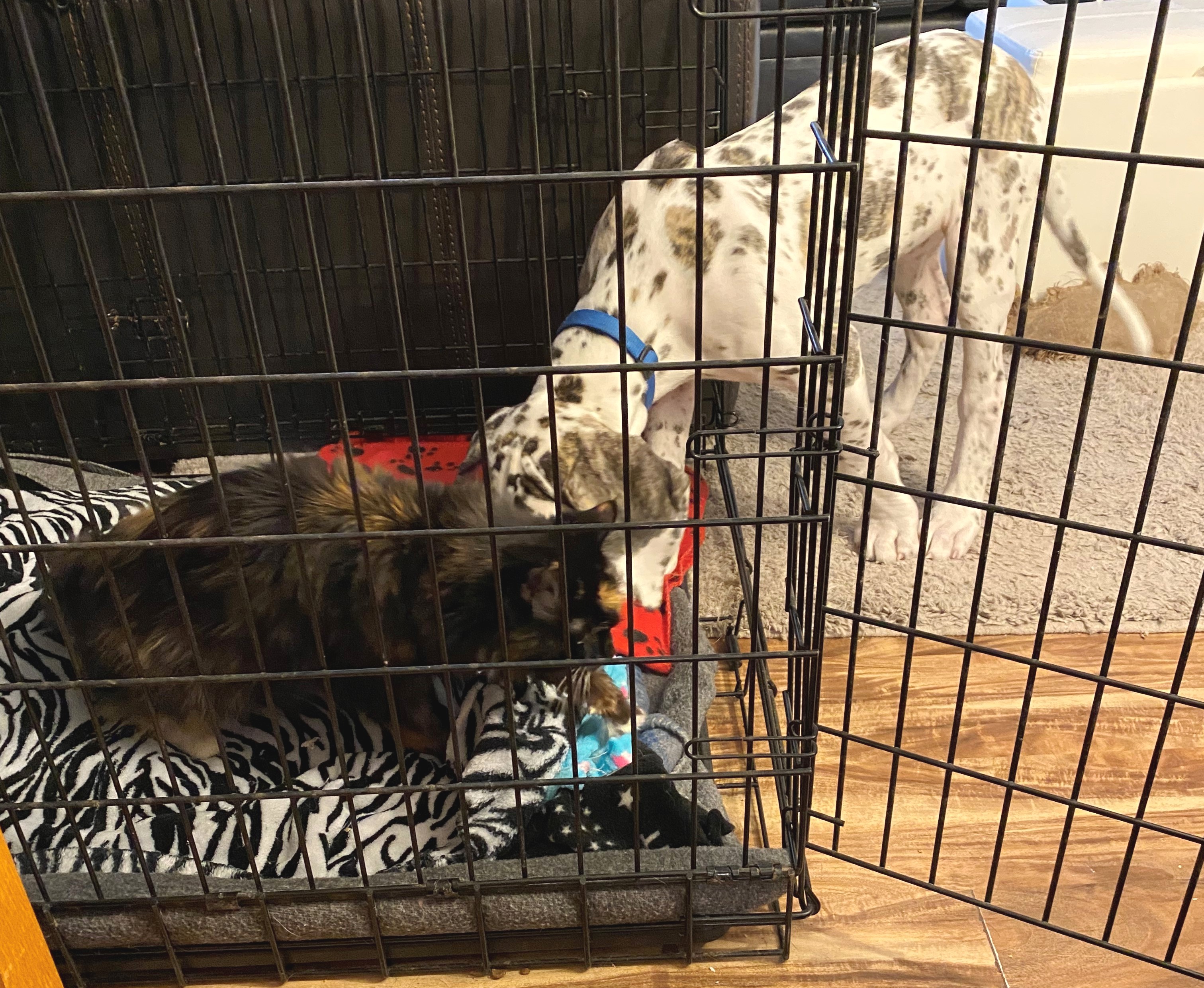 Emma would like everyone to know it is really her crate and she just lets the dogs borrow it. Here she is explaining that to Trixie, as she has explained it to each dog before.