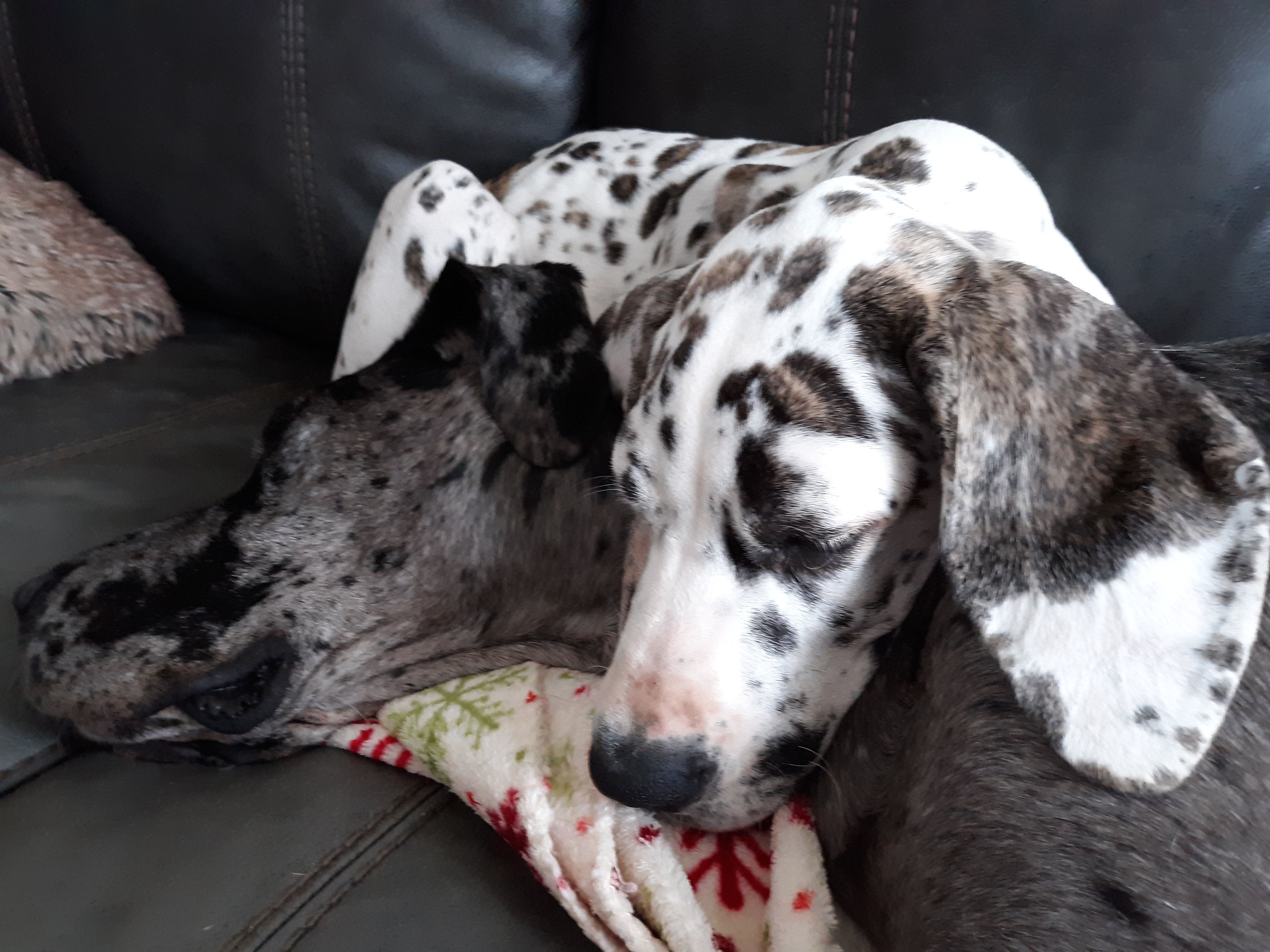It takes a lot of energy to grow a puppy to Great Dane size, so there is a lot of sleeping going on…and poor Scout is her favorite pillow.