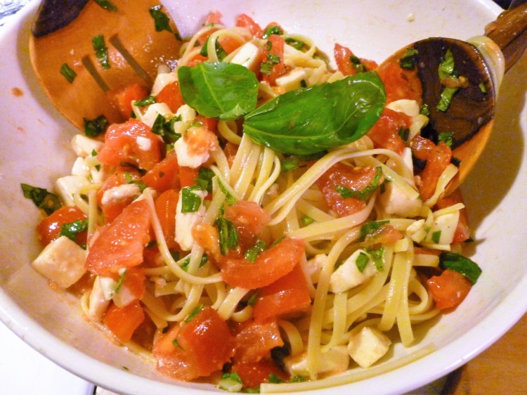 I use a fairly expensive mozzarella for this dish because it’s softer, tastier, and absorbs more flavors. Any locally produced mozzarella would work. Also, my local farmers’ market has a pasta vendor, who hand-makes many flavors of pasta. This dish works very well with flavored pastas – fire roasted chili, lemon pepper, tomato basil, red bell pepper – the list goes on. You can also change-up the cheese to a Queso Blanco (again, use a fairly expensive or locally produced one), use cilantro instead of basil and use a chili flavored pasta for a whole new dish. The possibilities are endless.