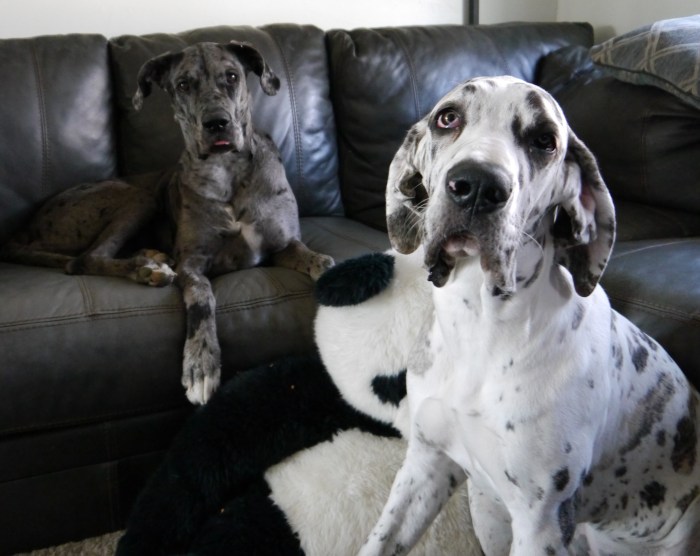 She thinks the dogs are just big friends. And has been known to walk over them on the couch. She follows Zander around like a little sister. He was a little annoyed at first but now seems to take great pride in it.